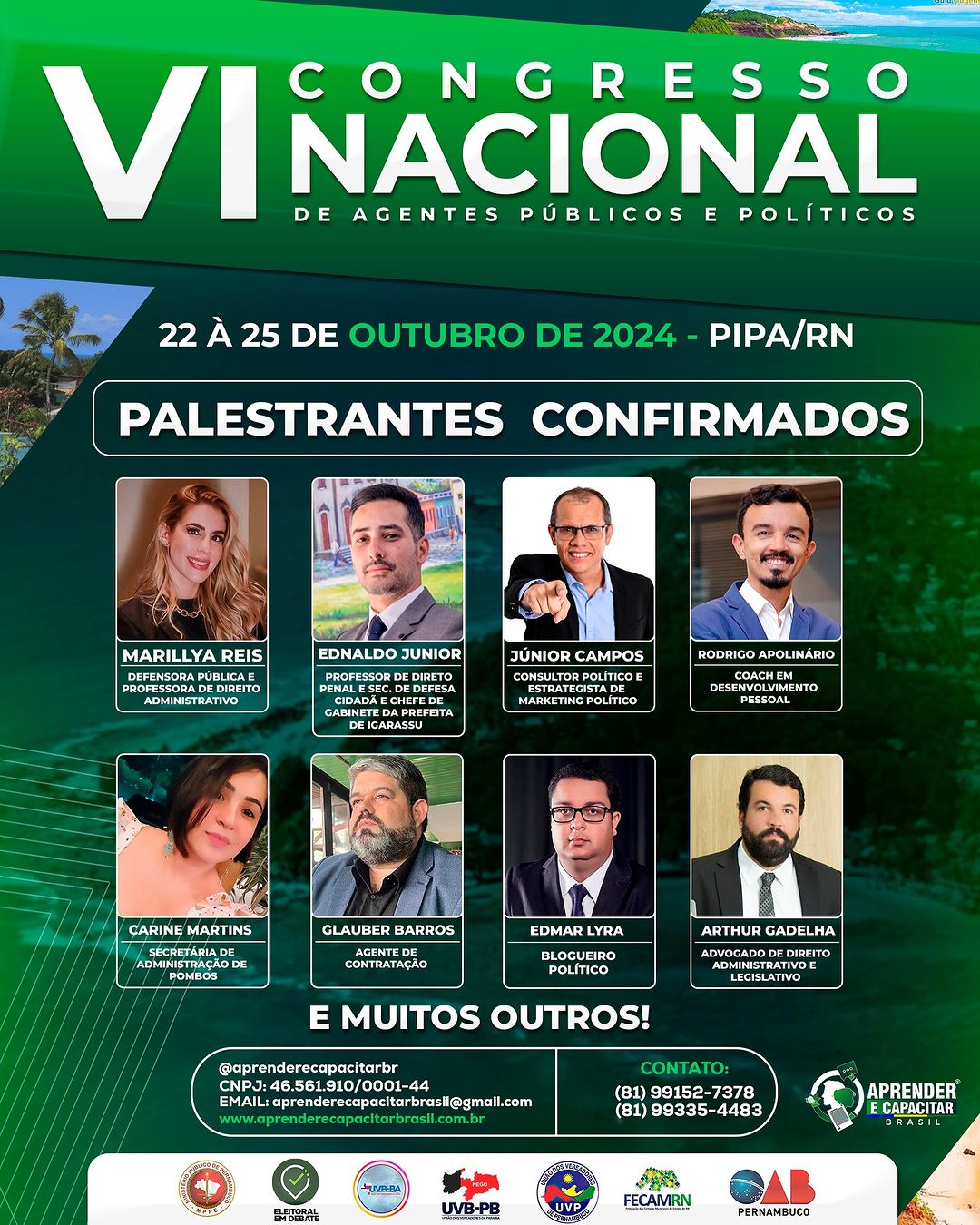 O Instituto Aprender e Capacitar, realiza, entre os dias 22 e 25 de outubro, no Hotel Pipa Atlântico, em Pipa-RN, o VI Congresso Nacional de Agentes Públicos e Políticos.