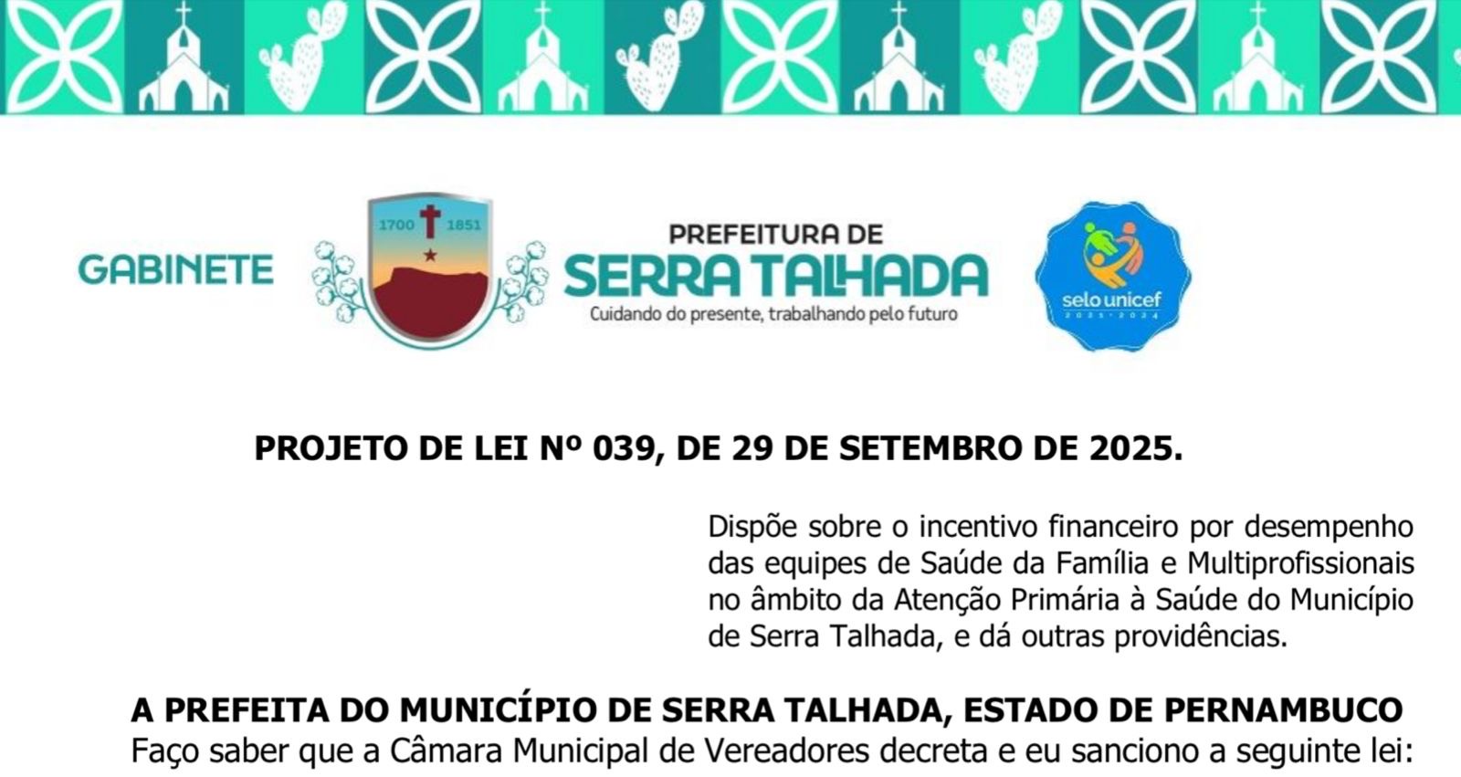 A Prefeitura de Serra Talhada encaminhou nesta segunda-feira (29/09) à Câmara Municipal o Projeto de Lei nº 035/2025, que propõe um novo modelo de cofinanciamento para as equipes de Saúde da Família, Saúde Bucal e Multiprofissionais da Atenção Primária. A iniciativa reforça o compromisso da gestão com a valorização dos profissionais da saúde e com a boa aplicação dos recursos públicos.