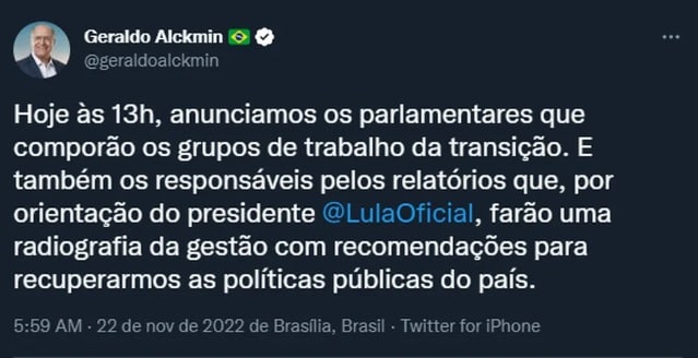 Até o dia 11 de dezembro, os grupos devem apresentar um relatório final, com análise dos programas implementados pela atual gestão, assim como dos programas das gestões do PT que foram descontinuados. Esses relatórios serão encaminhados à Coordenação Executiva do Gabinete de Transição, que fará um relatório final a ser entregue ao vice-presidente, que encaminhará ao presidente eleito. Os ministros indicados pelo presidente eleito receberão os relatórios de cada área.