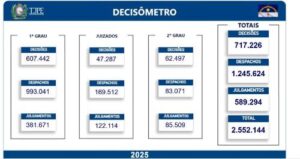 De acordo com os dados consolidados até 7h desta terça-feira (25/11), já foram proferidas 717.220 decisões, 1.245.613 despachos e 589.289 julgamentos, totalizando 2.552.112 atos entre o 1º Grau, Juizados Especiais e 2º Grau.