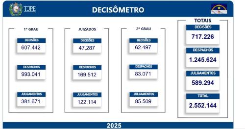 O Tribunal de Justiça de Pernambuco (TJPE) superou a marca de 2,5 milhões de atos judiciais em 2025, segundo atualização do Decisômetro, ferramenta criada pela atual gestão para garantir transparência e permitir que qualquer pessoa acompanhe, em tempo real, a produtividade do Judiciário estadual.