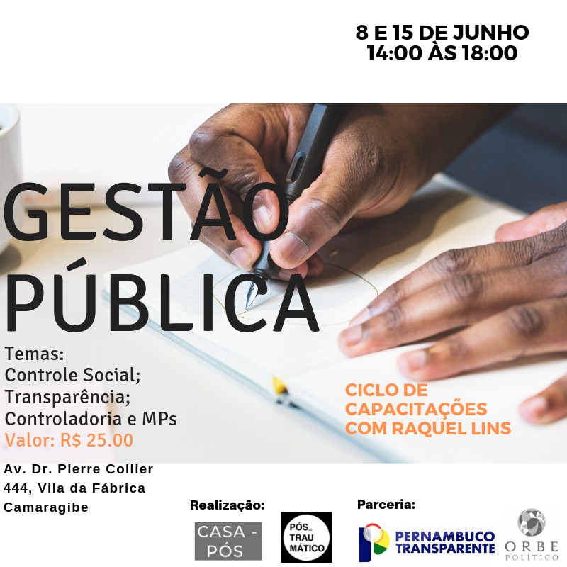 Em parceria com o projeto Pernambuco Transparente e o Orbe Politico, será realizada a Capacitação em Gestão Pública, ministrado pela cientista política Raquel Lins, tendo como foco temas relacionados a Controle Social, Transparência e MPs. Além destas abordagens será discutido como são destinados os investimentos em saúde, educação, cultura e funcionamento dos órgãos fiscalizadores.