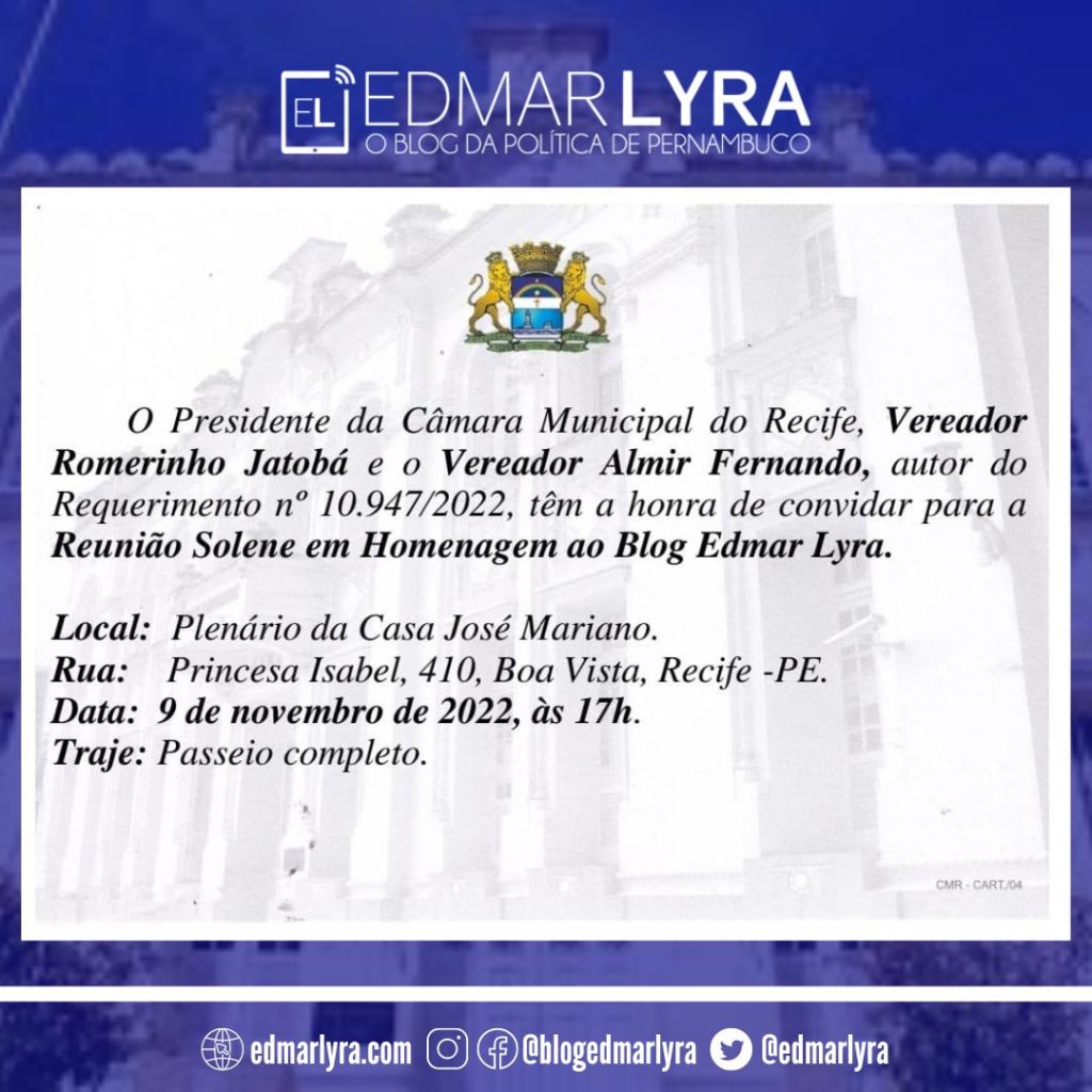 No próximo dia 9, quarta-feira, a partir das 17 horas, por iniciativa do vereador Almir Fernando, a Câmara Municipal do Recife realiza uma sessão solene em homenagem ao Blog Edmar Lyra.