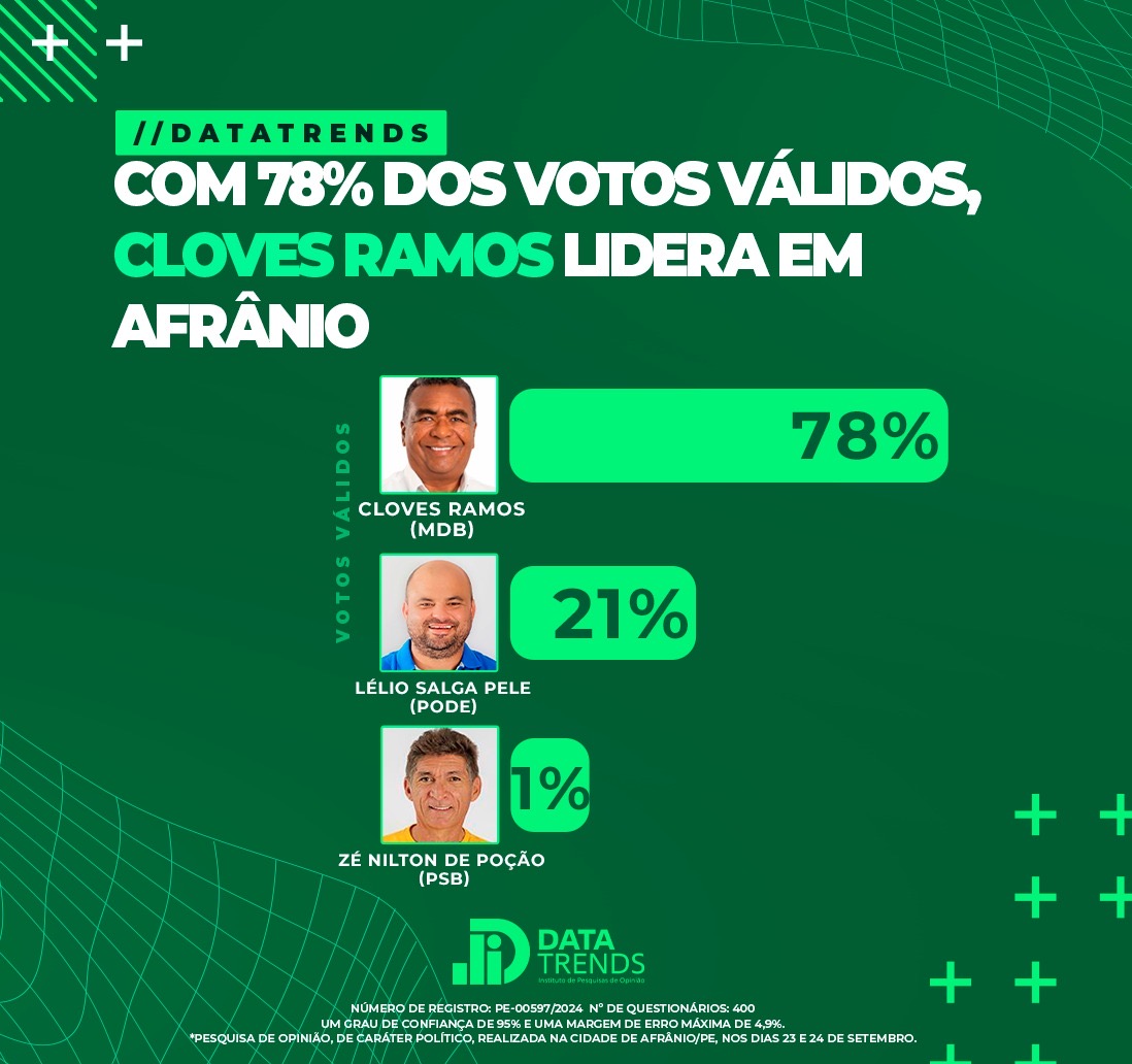 Pesquisa do Instituto DataTrends divulgada na madrugada desta terça-feira (01/10), mostra o candidato Cloves Ramos, liderando com larga vantagem na disputa pela eleição da Prefeitura de Afrânio.
