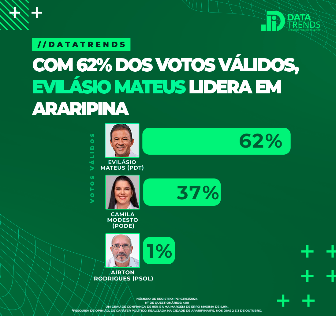 Pesquisa do Instituto DataTrends divulgada na madrugada desta sexta-feira (04/10), mostra o candidato Evilásio Mateus, liderando com ampla vantagem na disputa pela eleição da Prefeitura de Araripina.