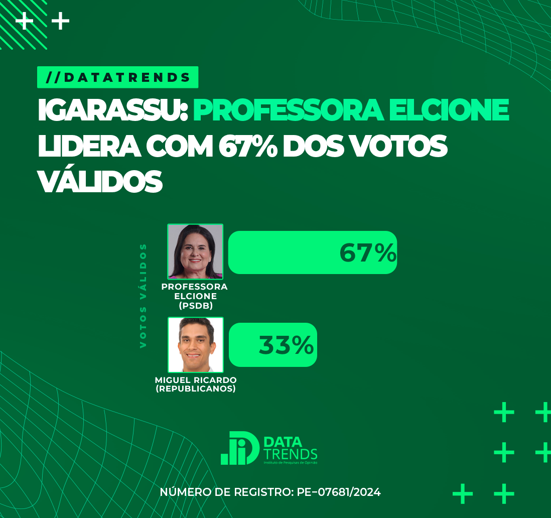 Pesquisa do Instituto DataTrends divulgada na madrugada desta segunda-feira (16/09), mostra a prefeita Professora Elcione, liderando com vantagem significativa na disputa pela reeleição da Prefeitura de Igarassu.