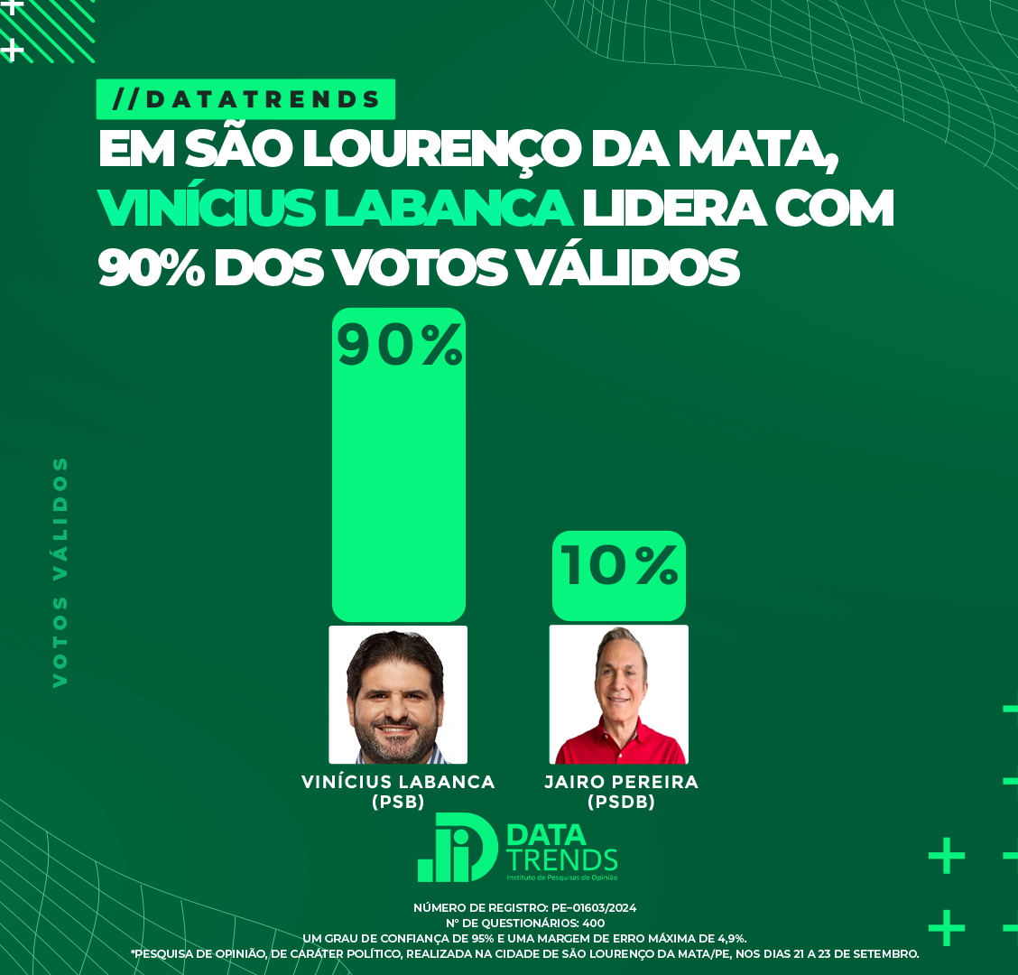 Pesquisa do Instituto DataTrends divulgada na madrugada deste sábado (28/09), mostra o prefeito Vinícius Labanca, dominando a liderança na disputa pela reeleição da Prefeitura de São Lourenço da Mata.