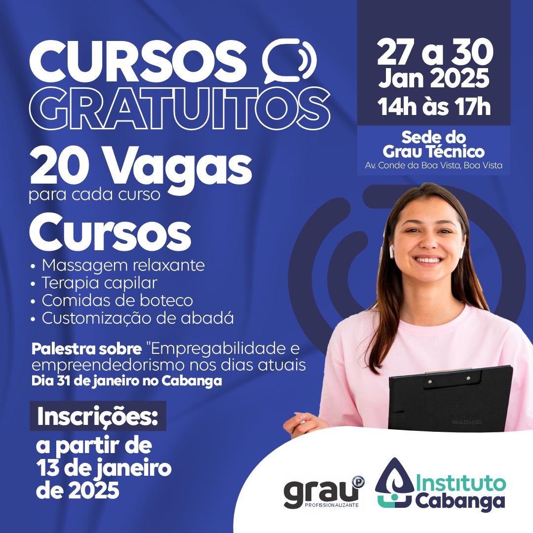 O Instituto Cabanga de Responsabilidade Social, em parceria com o Grau Técnico, dá início a 2025 com uma excelente oportunidade para capacitação. Serão oferecidos cursos gratuitos nas áreas de Beleza, Gastronomia e Costura, com foco no desenvolvimento pessoal e profissional de familiares do público feminino dos funcionários do Cabanga.