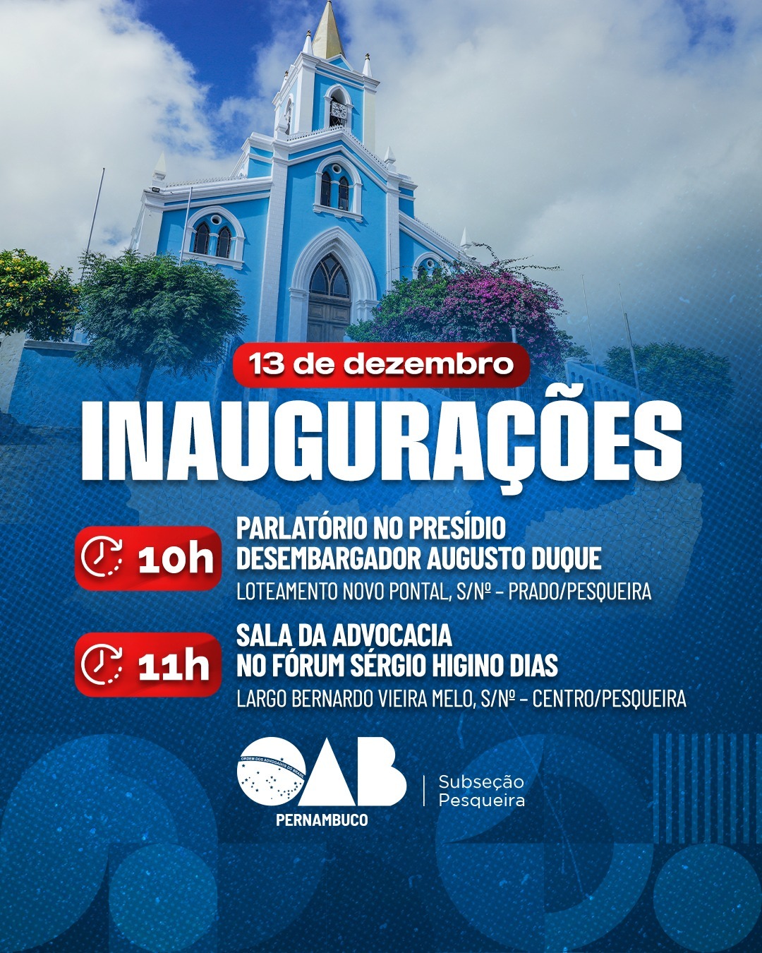 A programação começa às 10h, com a entrega do parlatório no Presídio Desembargador Augusto Duque, em Pesqueira, um espaço que vai garantir maior privacidade e segurança para os atendimentos advocatícios. Em seguida, às 11h, será inaugurada a Sala da Advocacia no Fórum Sérgio Higino Dias, também em Pesqueira, oferecendo mais comodidade e estrutura para os profissionais da região.