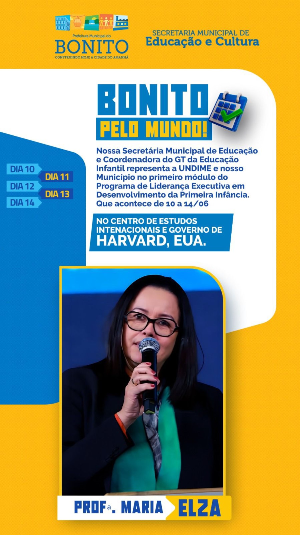 Diretamente de Harvard, nos Estados Unidos, a secretária Municipal de Educação de Bonito e coordenadora do GT da Educação Infantil, Maria Elza, está representando o município e a União dos Dirigentes Municipais de Educação de Pernambuco (UNDIME) no primeiro módulo do Programa de Liderança Executiva em Desenvolvimento da Primeira Infância.